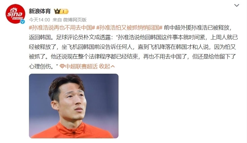 在统统东谈主同心计陈戌源的一审宣判时,另外一位备受心计的韩国籍前中超球员孙准浩也有了最新后果,据韩联社从韩外洋交部得知,韩国籍球员孙准浩为止了在中国约10个月的拘留之后,于3月25日抵达韩国,况兼从孙准浩亲一又口中得知,他被开释之后并未陈述任何东谈主,直到乘坐飞机抵达韩国仁川国际机场,才有关了支属和好友,况兼亲一又显现孙准浩接通电话后一直在哀泣,不仅感谢了友东谈主们一直对他的匡助,而且还宣称我方已留住了严重的心情创伤,更专诚旨真义的是,孙准浩还在电话中怒吼:“我方再也不会去中国了!”