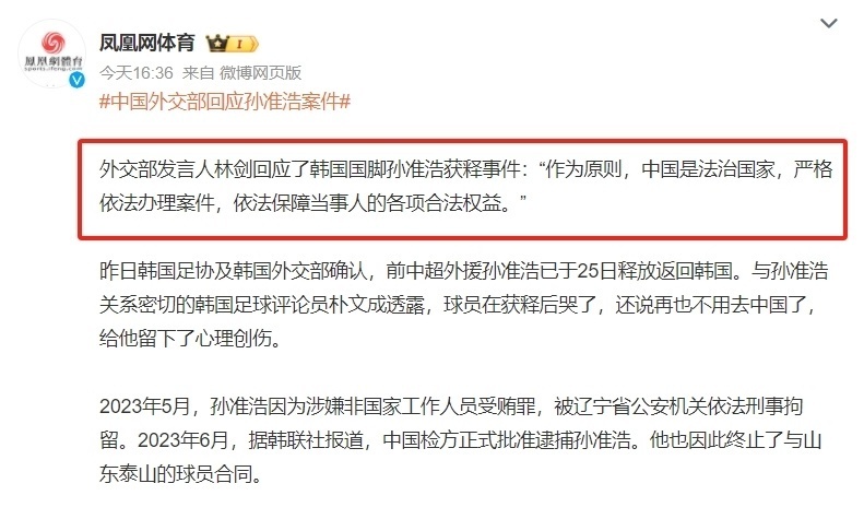 但让东谈主不测的是,哪怕入彀划对孙准浩还是拿出铁证并认定罪名,但据韩国电视台JTBC报谈,回到韩国的孙准浩,直到当今,依然是激烈否定任何对他的指控,长久主义的魄力是“我方无罪”,那么据韩国网友经营,孙准浩在被捕319天之后回到韩国,之是以宝石“我方无罪”的说法,很有可能是思回到韩国后,还能继续我方的足球生存,不外对此,我们中外洋交部却作念出了强势回话!